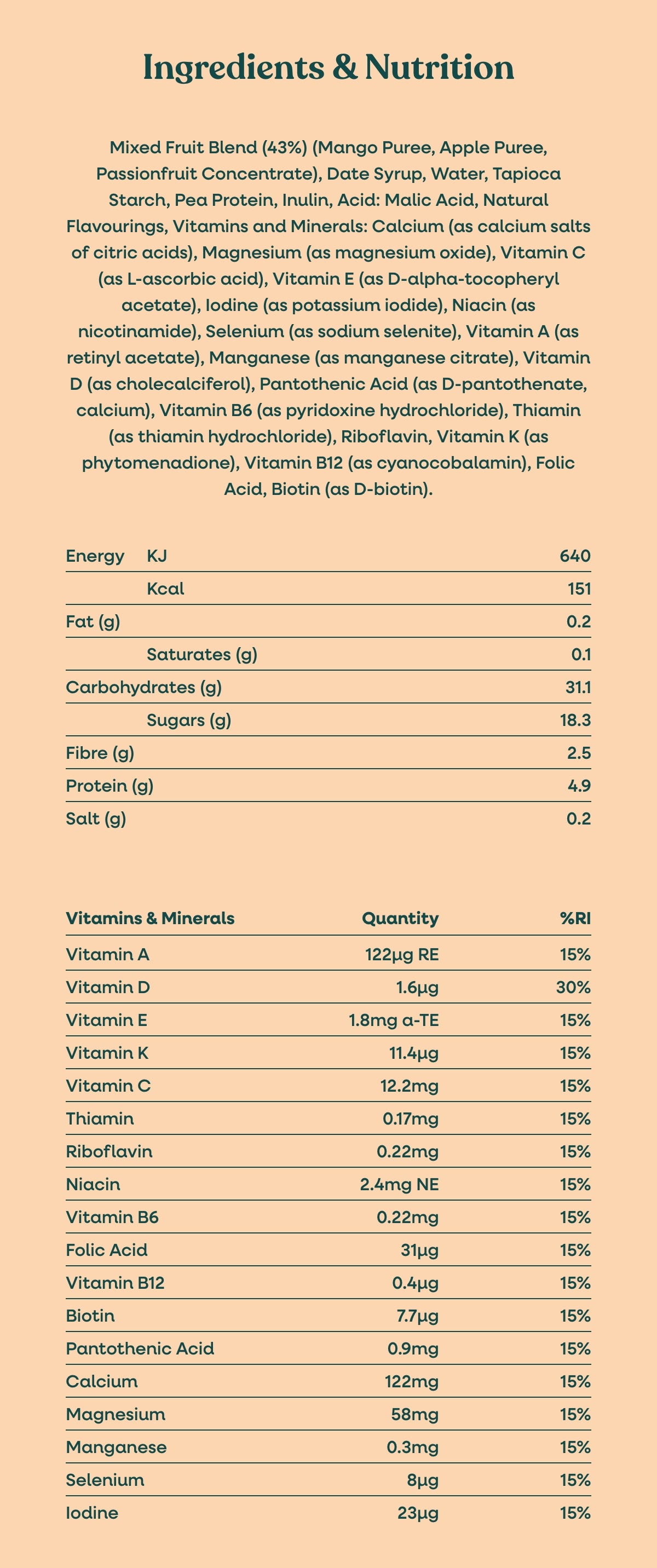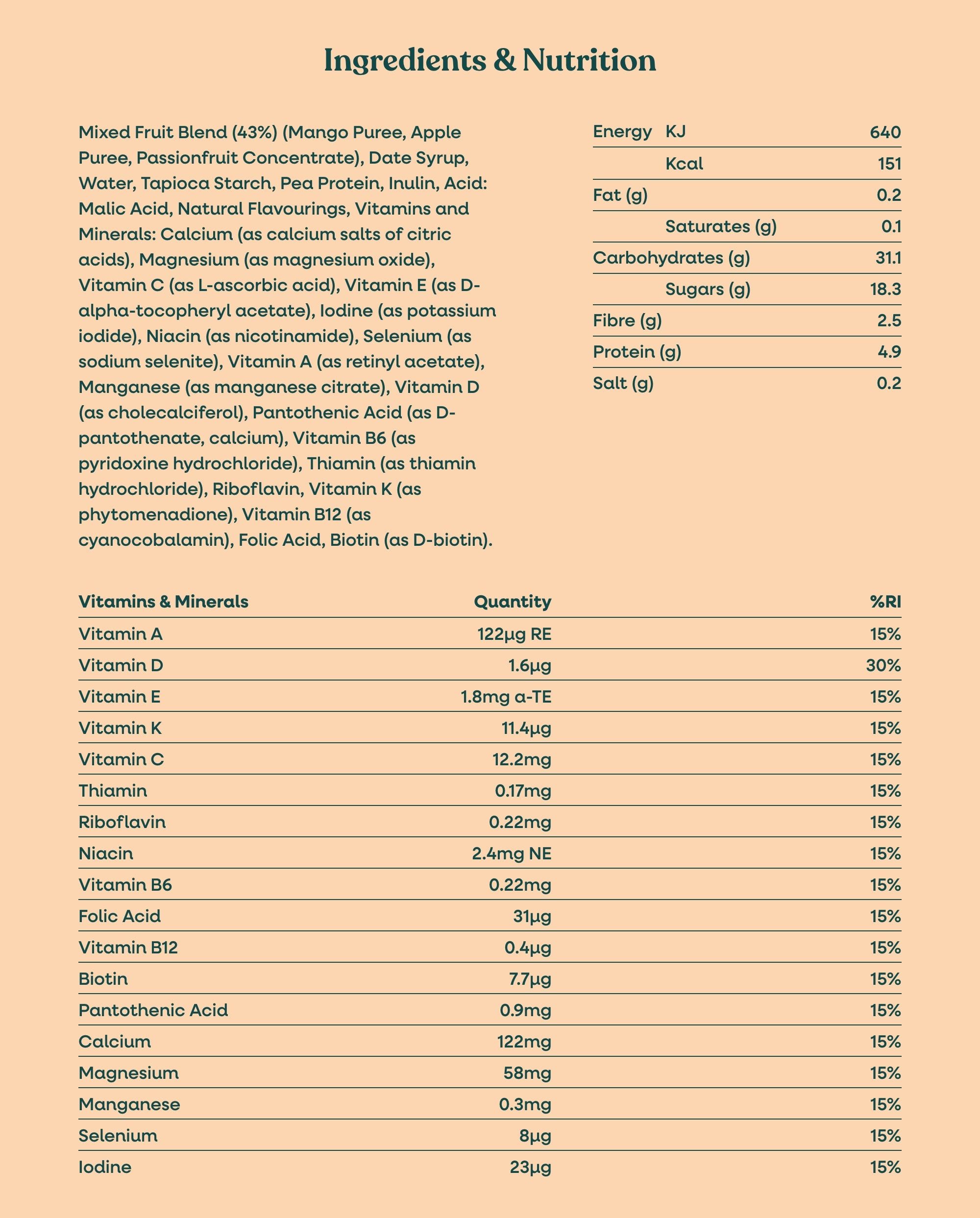 86ml packed with real fruit, protein, fibre, key vitamins and minerals. With a boost of calories.